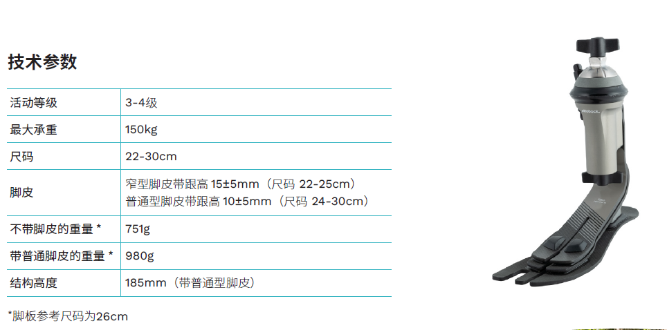 •脚板集成的功能环可实现+/-10 度抗扭转效果,降低接受腔与残肢之间的扭转力,也可大大降低作用于残肢的剪切力,